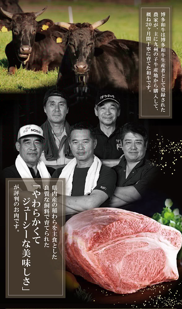 博多和牛は、生産者として登録された農家が、 県内産の稲わらを主食とした良質な肥料で育ってた 「やわらかくてジューシーな美味しさ」が評判のお肉です。