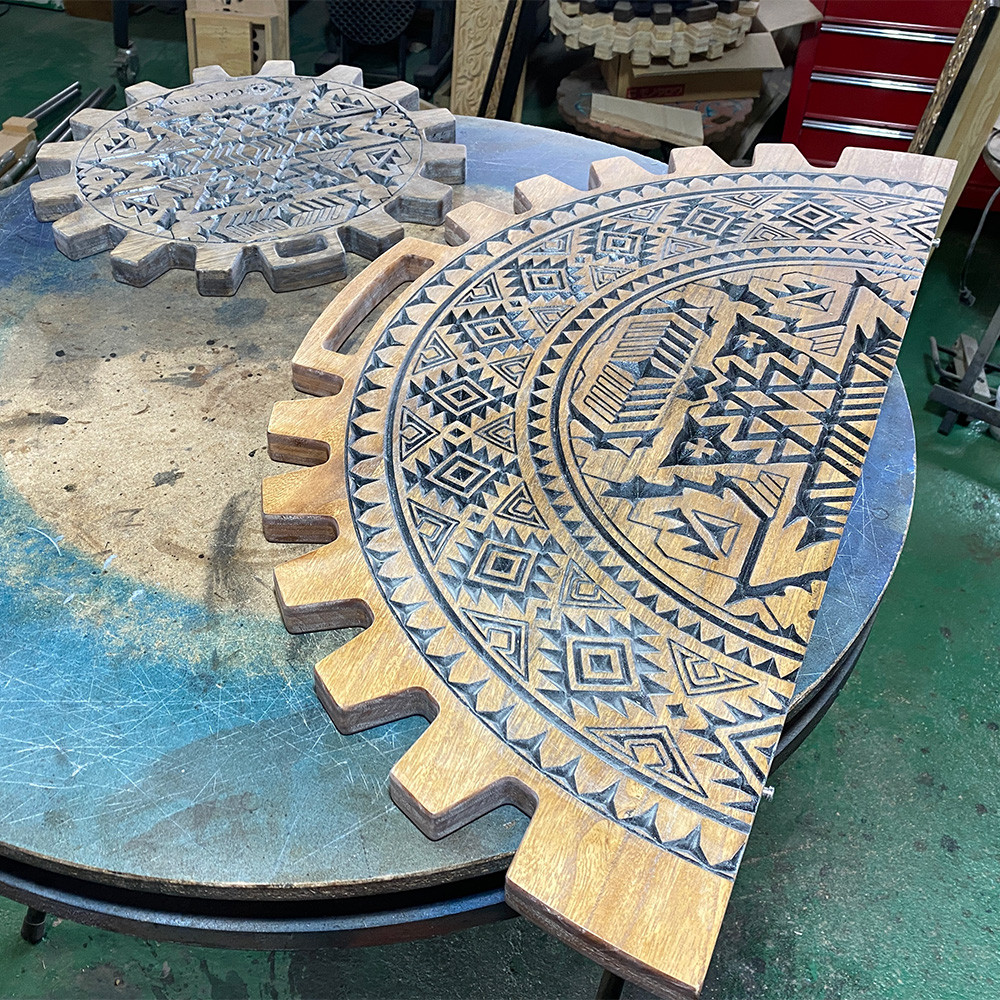 現在は自分が中心となって、従業員さんと2人で作業を行っています。テーブルに彫刻するデザインは、すべて自分が担当しており、当社オリジナルのものを作成しております。