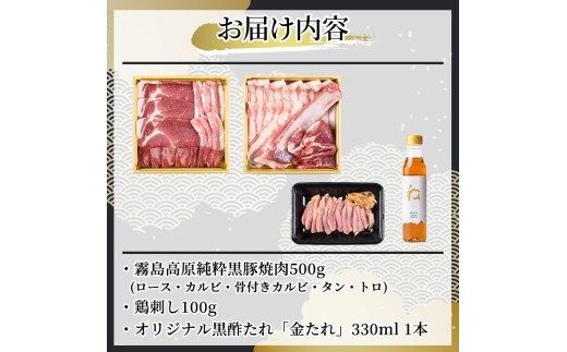 K-602 《ゲンセン霧島認定》霧島高原純粋黒豚焼肉・鶏刺しセット(計600g)オリジナル黒酢たれ付!【焼肉厨房わきもと】霧島市 豚肉 ヤキニク 焼き肉 国産 鶏肉 肉 豚 鶏 セット
