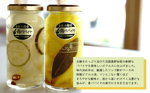 ・栄養が豊富で、抗酸化作用や健康維持にも注目される青パパイヤ。太陽をたっぷり浴びた淡路島野田尾の新鮮なパパイヤを美味しいピクルスに仕上げました。