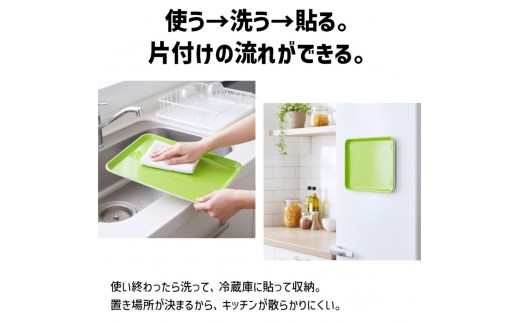 配膳に使ったら水洗いして拭き取り、冷蔵庫やスチール棚の側面に貼って収納できます。置き場所が決まるので、取り出しや片付けがスムーズ。表面はすべり止め加工で食器がずれにくいです。