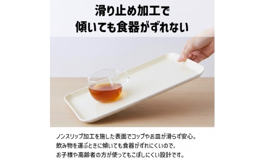 表面のすべり止め加工で、コップやお皿が滑りにくく配膳が安定します。飲み物を運ぶ時やテーブルへ移動する時も手元がぶれにくく、毎日の食事がスムーズになります。お子さまのお手伝いにも使いやすい設計です。
