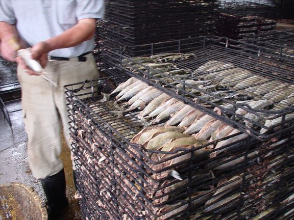 鯖を乾燥室(燻製室)に入れます。
