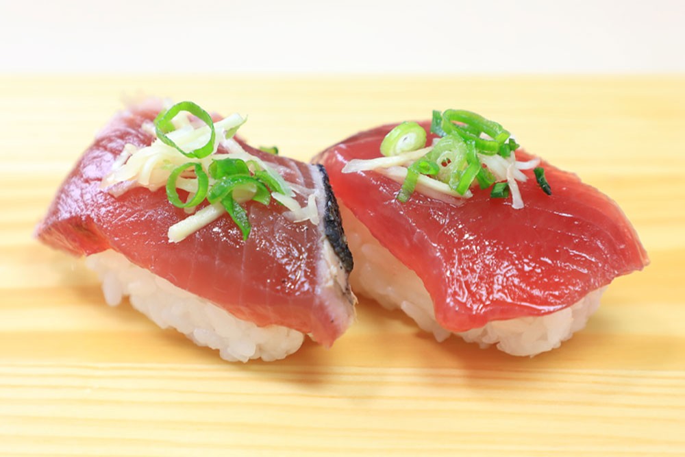 近海で漁獲されたカツオが迅速に水揚げされるため、鮮度が非常に高いのが特徴です。一本釣りで丁寧に獲られた勝浦市産カツオを、握り寿司で贅沢に。しっとりした口当たりと旨みが、海の恵みを語ります。