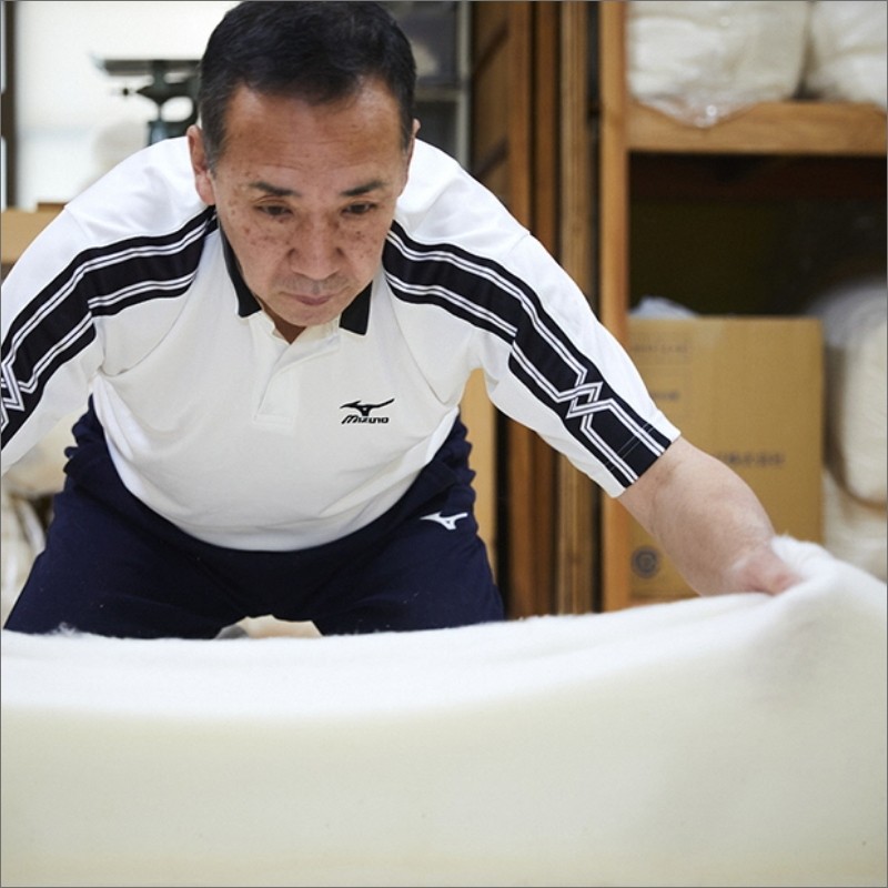 「あたたかくて気持ちがいい」「よく眠れる」そんなお客様の声が嬉しくて、ふとん作りを続けています。ふとんで一番大事なのは中身です。用途に適した綿選び、段差やゆがみのない綿の仕立て。ふとんの「中」の良さは、使い続けることでわかるものです。当店では厚生労働省認定の寝具技能士が、一枚一枚手作業でお仕立てしています。