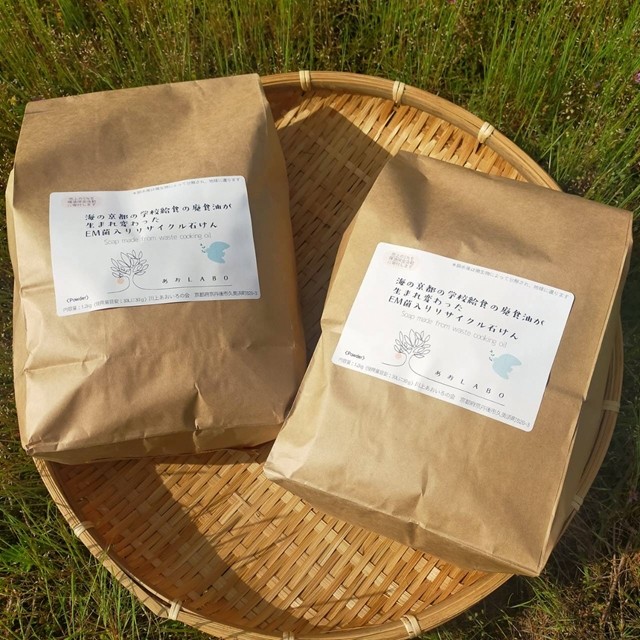 京丹後市の学校給食などの天ぷら油が生まれ変わったEM菌入りリサイクル石けん