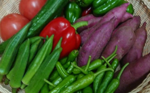 さつまいも、つるむらさき、なす、おくら、ズッキーニ、ピーマン、きゅうり、ジャガイモ、豆類(インゲン豆ほか)、パプリカ、ししとう、トマト、かぼちゃ、青しそ、ねぎ、サニーレタス、玉ねぎ、ゴーヤ、空芯菜、モロヘイヤ、にんにく、ニンジン、キャベツ、大根、りゅうきゅう、とうもろこし