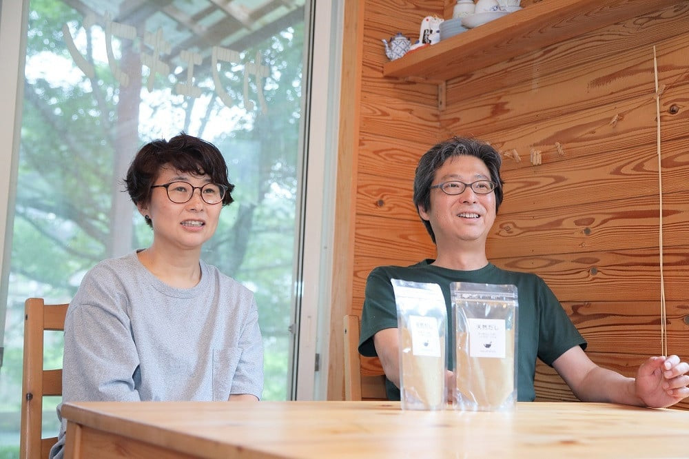 「乾燥椎茸は美味しいけど、水で戻したりと手間がかかります。もっと気軽に健康食材である椎茸を取り入れることができないか。乾燥椎茸にする過程で出てしまうロス食材をなんとか活用できないか。工夫を重ね、できたのがこの粉末の天然だしです。」