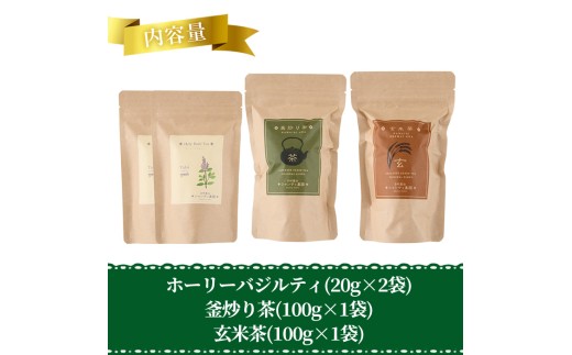 シャンティ農園セット(合計240g・3種) お茶 茶 茶葉 釜炒り茶 緑茶 玄米茶 バジル ホーリーバジル 無農薬 無肥料 ノンカフェイン 【MU033】【村おこし総合産業】