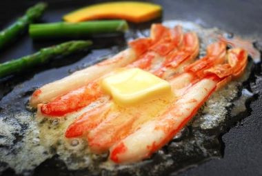 山積みにされたトキサケ(トキシラズ)とベニザケに、茹で上げたばかりの大きな花咲ガニ、