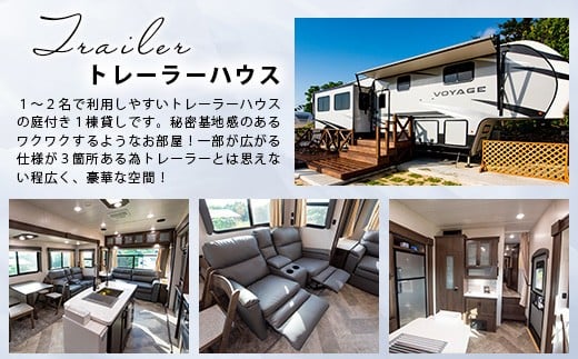 1~2名で利用しやすいトレーラーハウス付きの1棟貸しです。秘密基地感のあるワクワクするようなお部屋です。お部屋の一部が広がる仕様が3箇所あるため、トレーラーとは思えないほど広く、豪華な空間となっております。