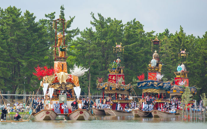 夏に開催される、尾張津島天王祭。500余年の歴史があり、日本三大川祭りの一つに数えられている国指定重要無形文化財です。毎年7月の第4日曜日に開催され、朝祭では東保町から市江車が参加します。6艘の車楽船の先頭を切って天王川を進んでいきます。10名の鉾持が市江車から川へ飛び込む様は力強く、見所の一つとなっています。ぜひ、お越しください。