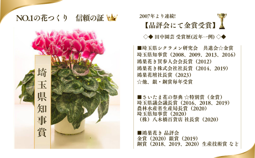 シクラメンは、創業より生産直売を行っており、毎年の直売会を楽しみにされ遠方より来園される方、贈答用に購入される方も多くいらっしゃいます。