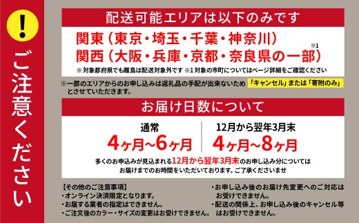 ※12月~3月末のお申込み分については、多くのお申込みが見込まれるため、お届けまでに4ヶ月~8ヶ月お時間をいただきます。