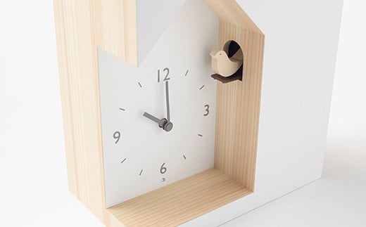 四角い箱から鳩時計がくり抜かれたような、シルエットが凹んだ鳩時計。側面に空いた小さな穴から、鳩が横方向に顔を覗かせる。