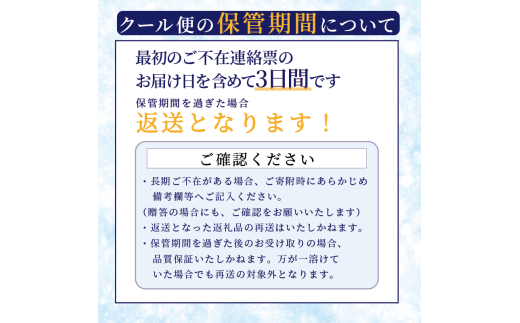 ・保管期間を過ぎた後のお受け取りの場合、品質保証いたしかねます。万が一溶けていた場合でも、再送の対象外となります。