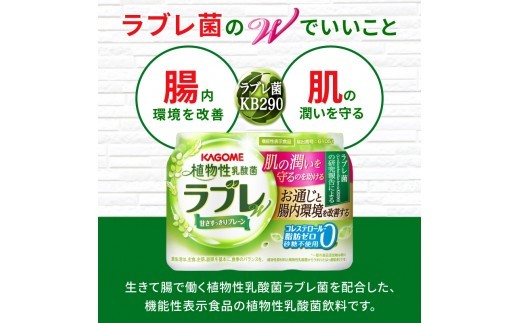 生きて腸で働く植物性乳酸菌ラブレ菌を配合した、植物性原材料と植物性乳酸菌からうまれた機能性表示食品の植物性乳酸菌はっ酵飲料です。ラブレ菌は、お通じと腸内環境を改善すること、肌の潤いを守るのを助けることが報告されています。乳などの動物性原料不配合、100%植物性(*一部の食品添加物は除く)で脂肪・コレステロール0。砂糖不使用、りんご・大豆のコクとライムの爽やかな味わいですので、朝の目覚め、お風呂上りや夜寝る前などにもおすすめです。おなかの調子を整えたい方、肌の乾燥が気になる方の毎日の健康とキレイを、おいしく手軽にサポートします。