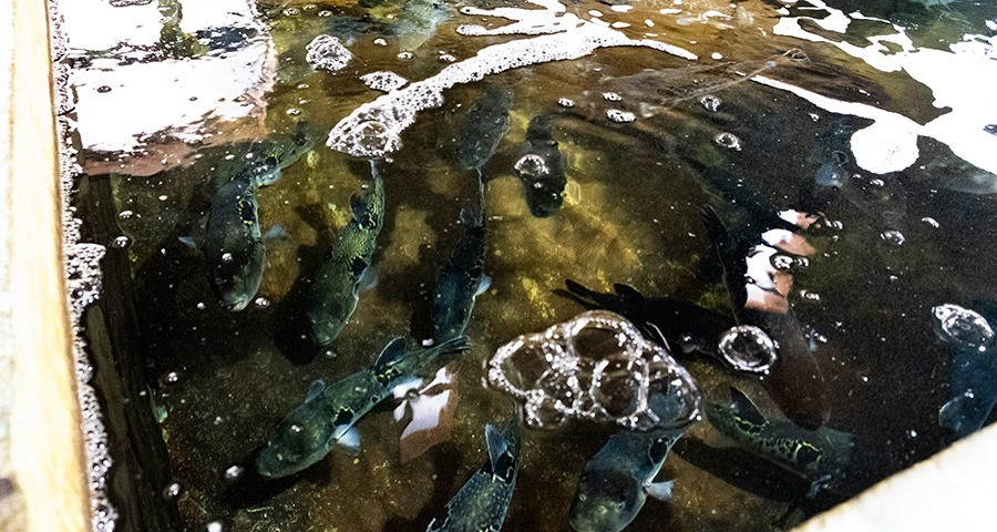 そして漁船が帰港すると、仲買人たちはイケスで泳ぐ「あのりふぐ」の品質を素早く見定めて、船上で一隻ずつ入札が行なわれます。
