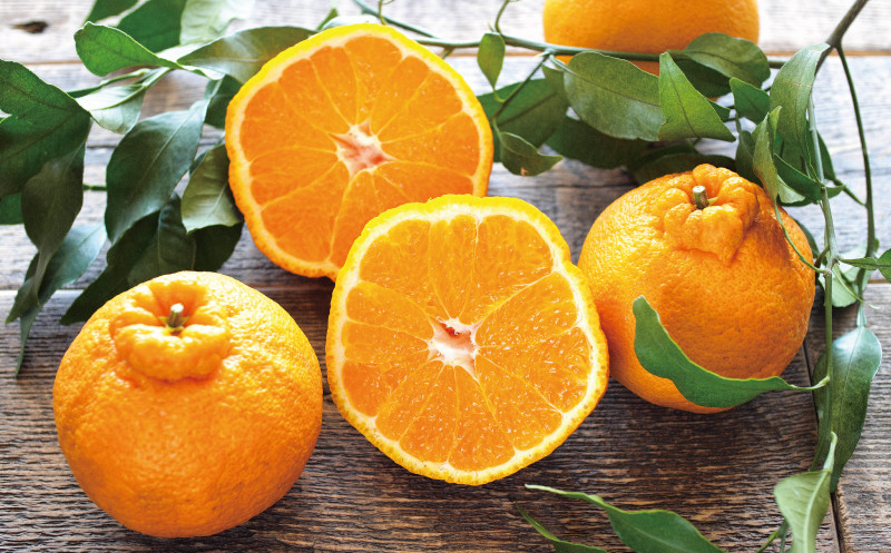 デコポン似の柑橘類です。内皮が柔らかくそのまま食べられます。甘酸っぱい少し炭酸感のある、迫力がある味が楽しめます。