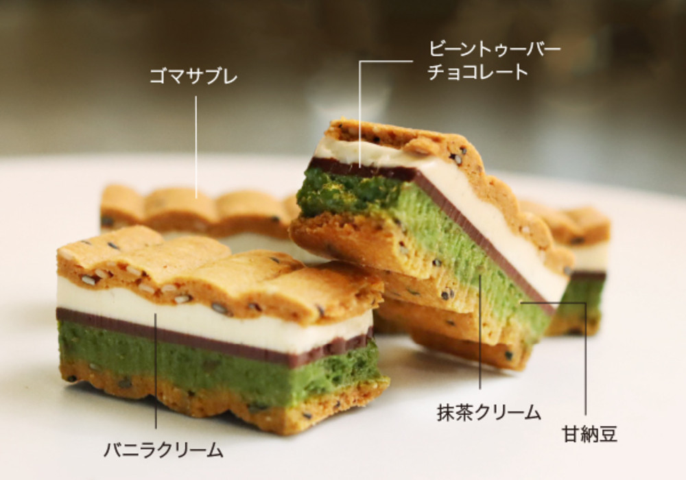 プレーン・ショコラ・ゴマの波型サブレに、それぞれ3種の軽やかなクリームと食感と味のアクセントとしてカカオ豆から作った自家製Bean to Barチョコレートを挟んだ、サクサク食感の楽しいクリームサンドサブレ。