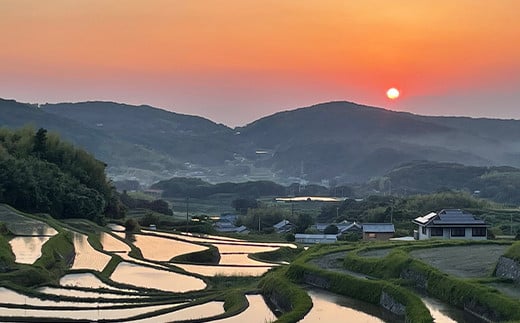 田植えの時期には、水面が夕日を映し美しい風景が広がります。