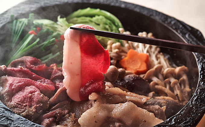 季節で異なる味わいを楽しむイノシシ肉の食べ比べセットです。「冬猪」は木の実をたくさん食べて上質な脂身を蓄えています。新芽や筍を食べている「夏猪」はアッサリとした後味が特徴です。地元産の味噌、しょうがニンニクで香りをつけた鍋用の味噌ですき焼き仕立てで調理し、卵につけてお召し上がりください。