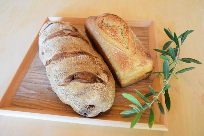 オリーブを発酵させた酵母をもとに種を継ぎながら(ルヴァン種)、国産小麦粉・塩・水のみでこね上げてゆっくり発酵させます。
