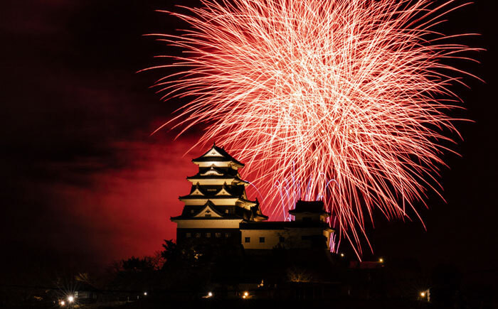 夏、肱川で捕れた鮎の塩焼きや夏野菜料理、大洲川まつりの花火大会で大洲城をバックに花火を楽しめます。