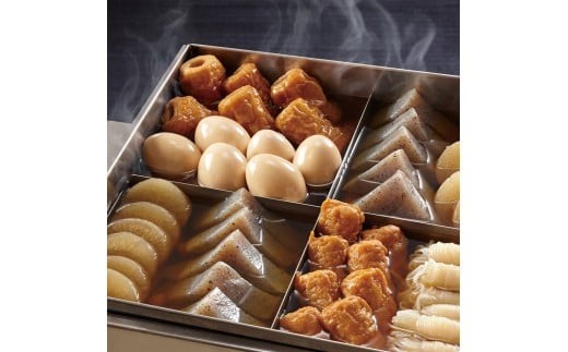 かつおベースのだしにアゴだしを加えた本格スープで味付けし、九州ではベーシックな6種類の具材(糸こんにゃく・ちくわ・玉子・ごぼう巻・三角こんにゃく・大根)が入ったレトルトおでんです。